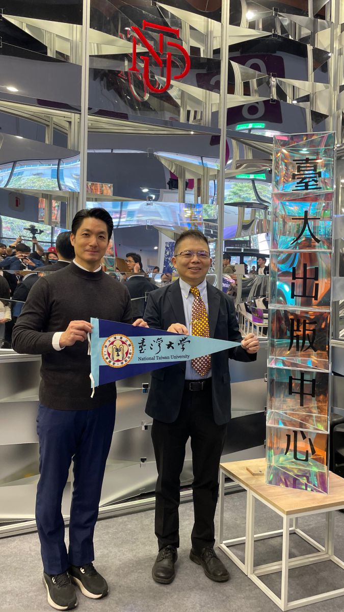 台北市長蔣萬安(左)蒞臨臺大展位,出版中心主任張俊哲(右) 與市長持臺大錦旗留念。